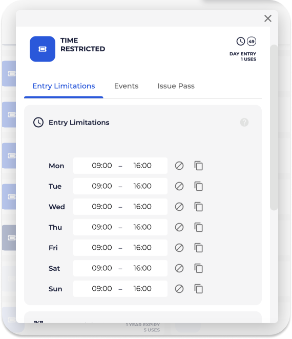 Note, If time entry limitation is empty, the pass will be valid at all hours, on all days of the week.