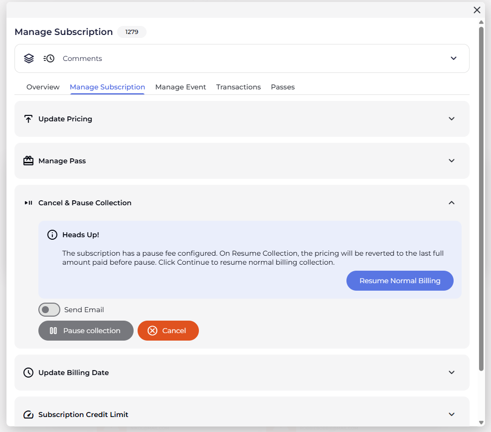 Pausing passes linked to a subscription requires navigating to the Subscription Details tab.
