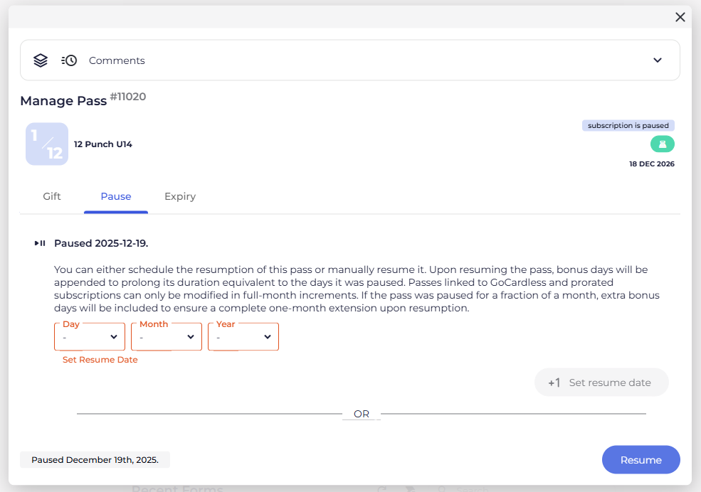 If a recurring subscription that started on the 1st of the month is paused on the 15th, when un-paused, there will be 15 days left in that billing cycle and for the associated expiry of the pass (i.e., entry type).