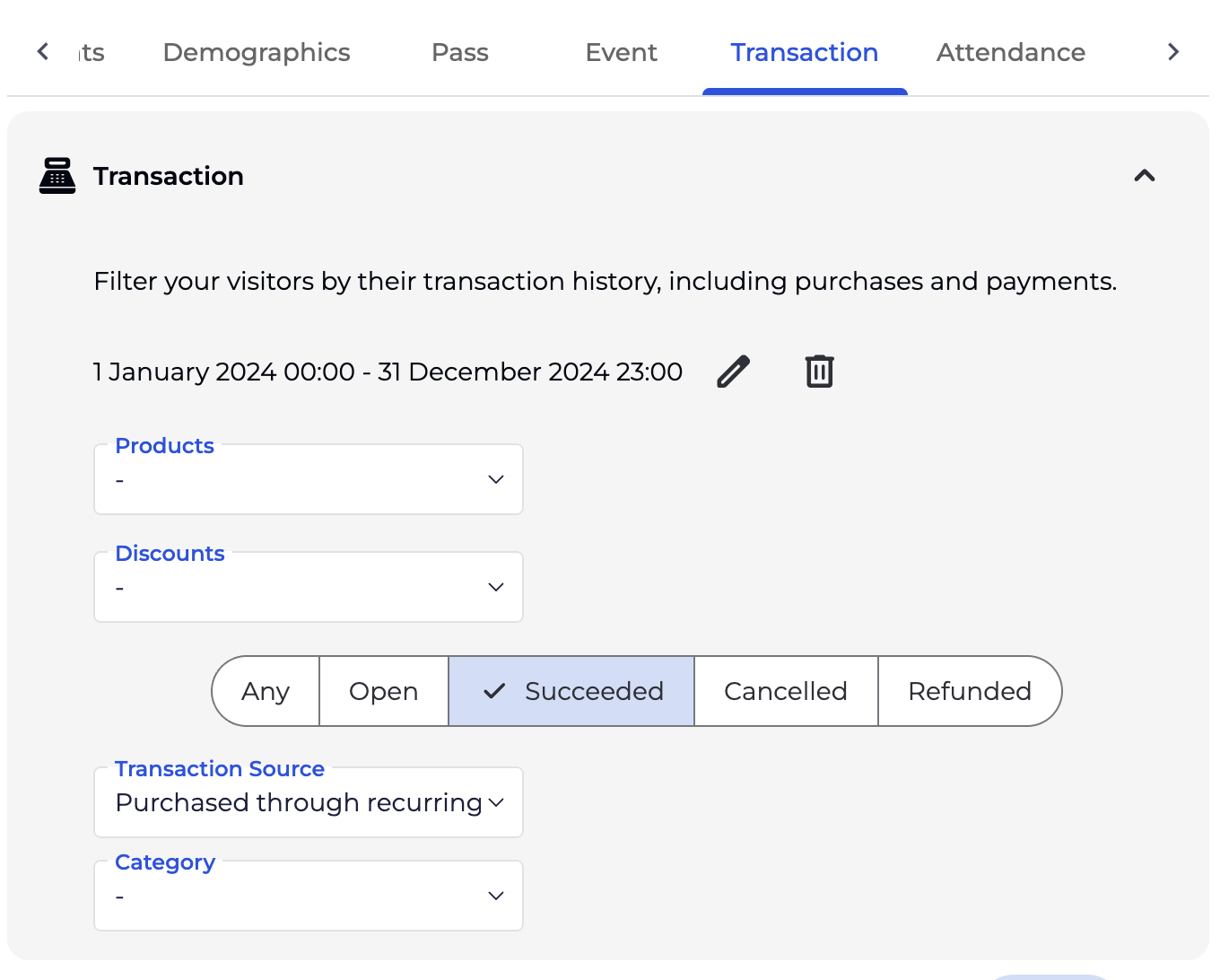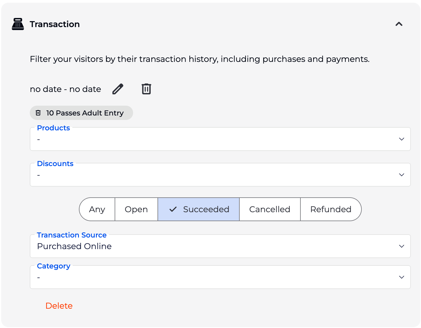 Example is profiles who purchased a 10 punch Pass where the Transaction source was online.