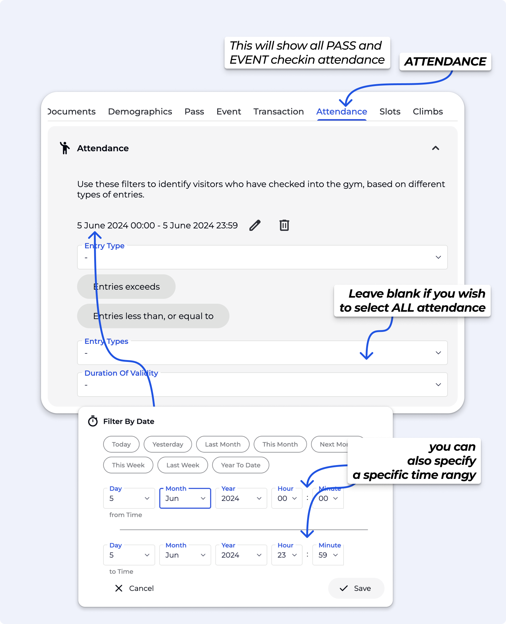 Remember to consider your facility's operating hours when setting date filters for accurate attendance reports.