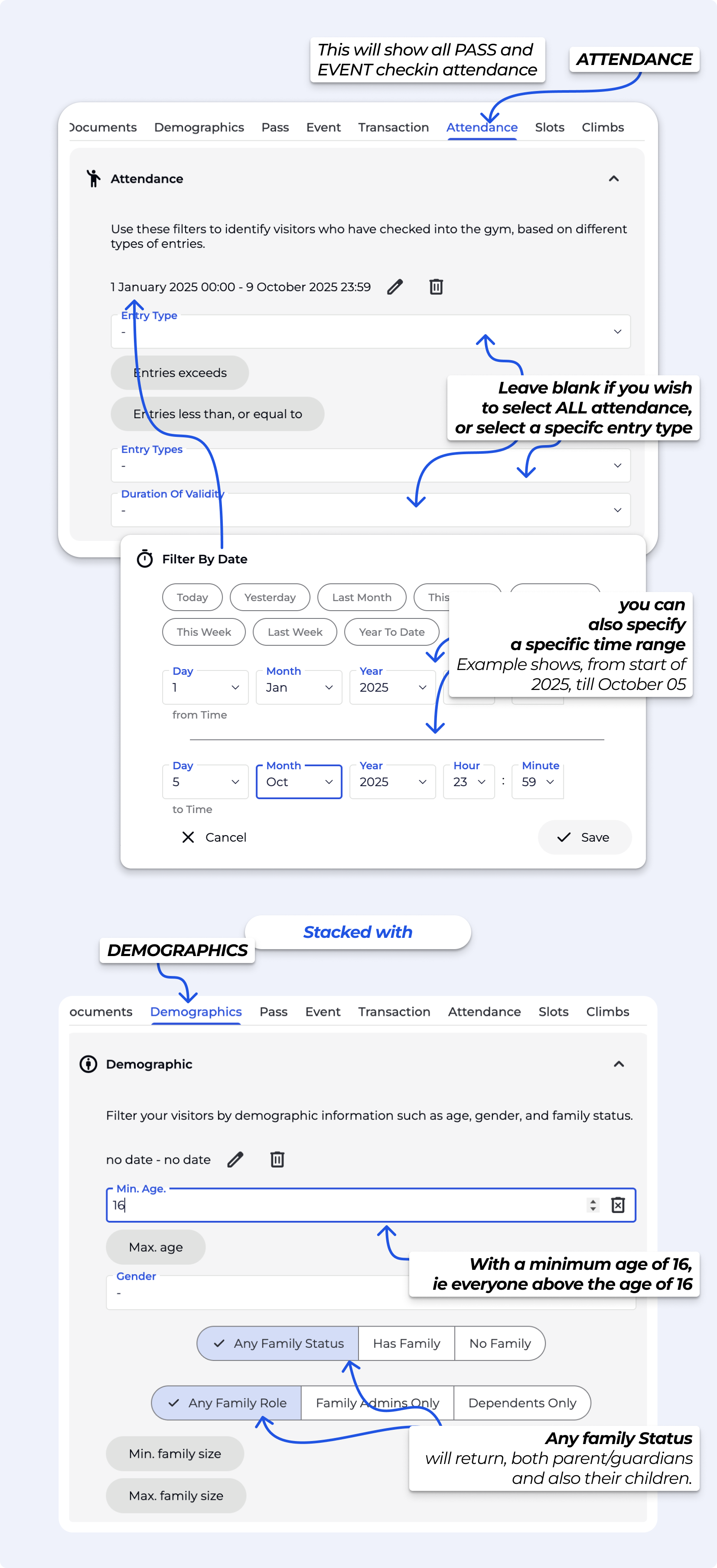 Each query can be customized using filters. Filters define which part of that data you want to look at and help you narrow down the data to exactly what you need. You can apply multiple filters simultaneously to refine your climber view.