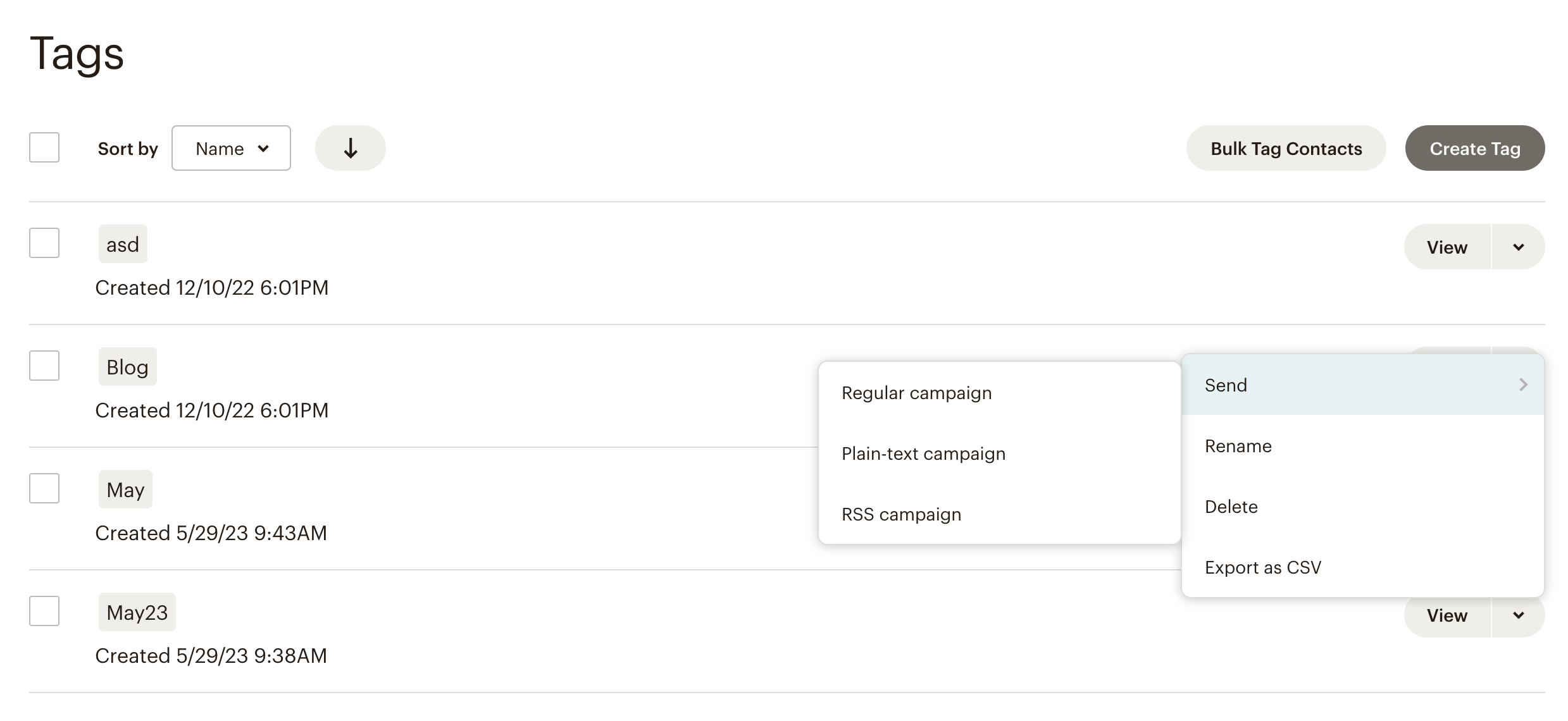 To send a campaign to a Segment, select “Regular campaign” in the send menu from the given Tag.