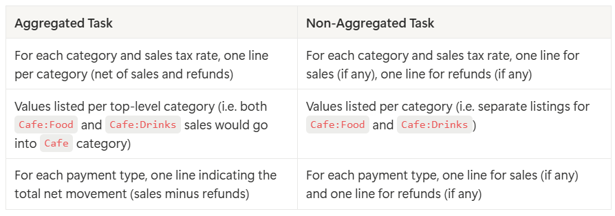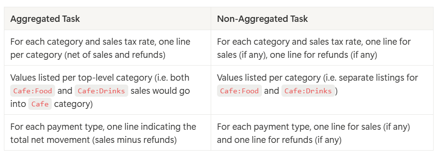 Non-Aggregated provides a more detailed breakdown of sales, refunds, and categories.