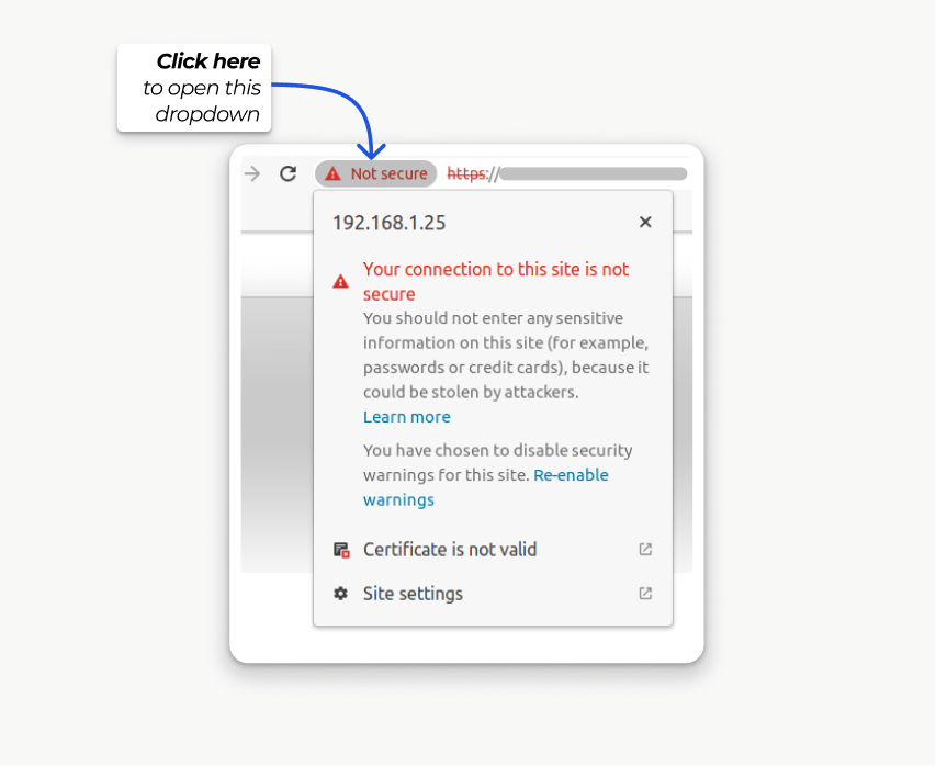 Start by accessing your ePOS printer settings on your web browser by navigating to its IP address (e.g., https://192.168.1.25). Then, force the connection as explained in the Generate a self-signed certificate tab.