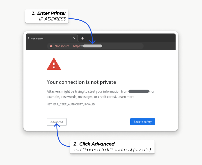 Navigate to the printer’s IP address (e.g., https://192.121.1.22) and force the connection by clicking Advanced and Proceed to [IP address] (unsafe).