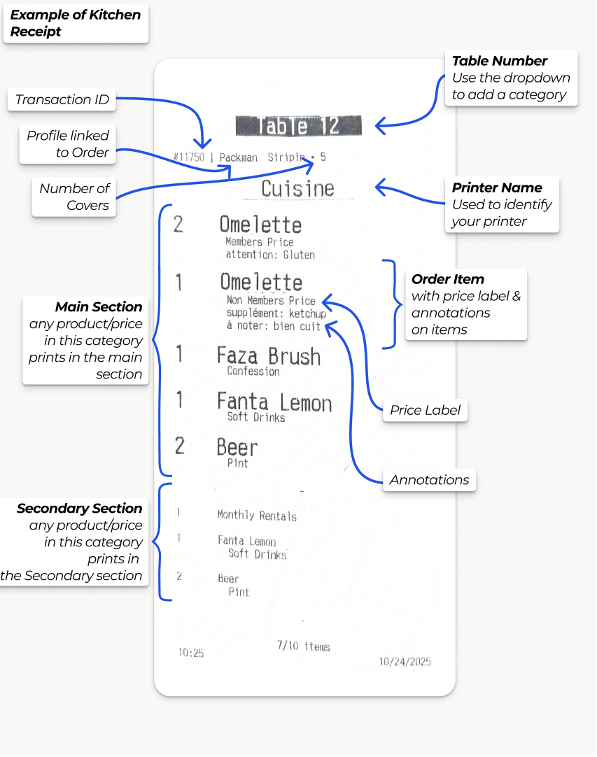 BETA supports multiple printer connections, allowing you to assign specific printers for different tasks. You can also designate a printer as a Kitchen Printer for processing food and drink orders. If no categories are assigned, the printer will print all items from the transaction.