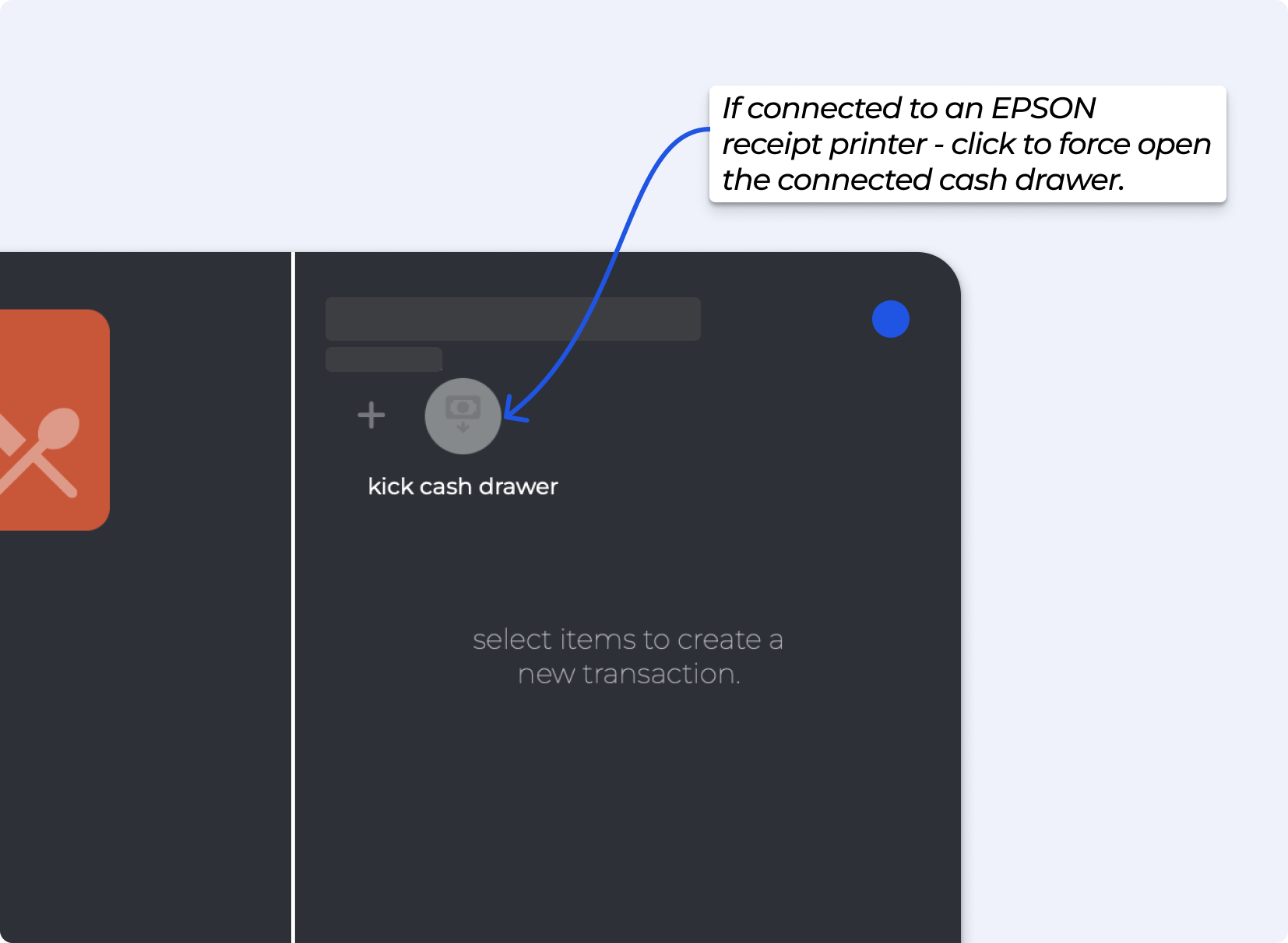 The cash drawer connects directly to your EPSON receipt printer. This means the drawer can only be opened ("kicked") through the POS if it is plugged into the printer. If the drawer isn’t connected to the printer, the open command will not work, and the button on the POS will display.