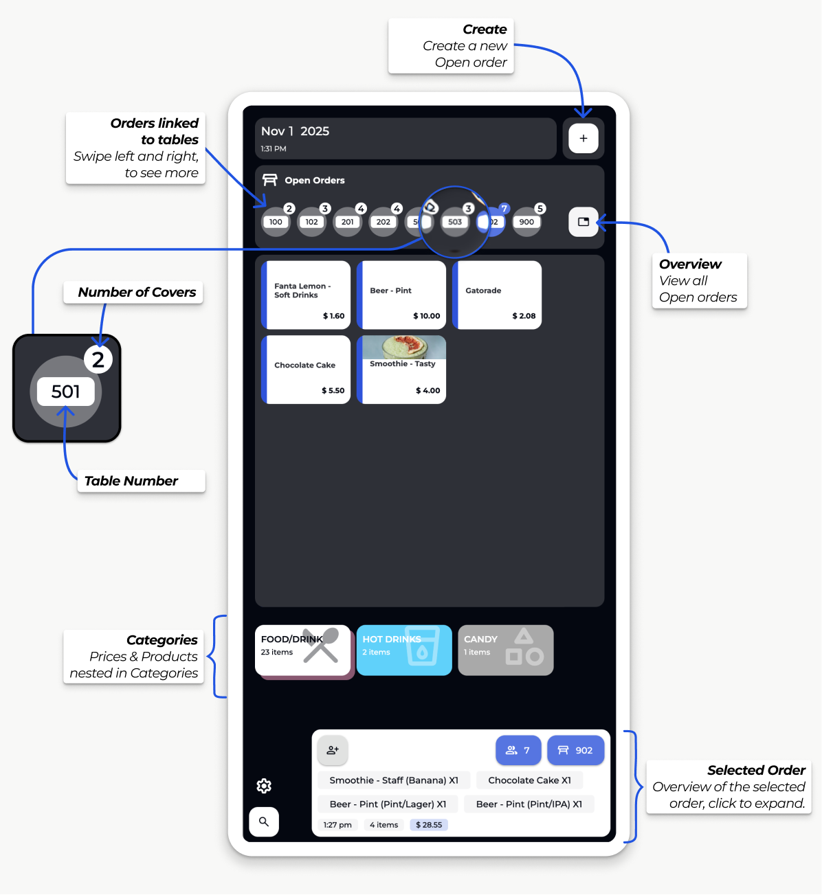 The POS Café / Restaurant is a dedicated point-of-sale system designed for your café or restaurant operations. It provides an intuitive, table-based layout that’s optimized for mobile and tablet use, making it faster and easier to manage orders, tables, and covers compared to the main POS.