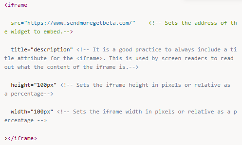 You can control the width and height of the embedded widget. To control the width and height of an iframe in HTML, you can use the width and height properties on the iframe itself, or use the width and height style properties. The values for the width and height properties can be specified in pixels, percentages, or other units.