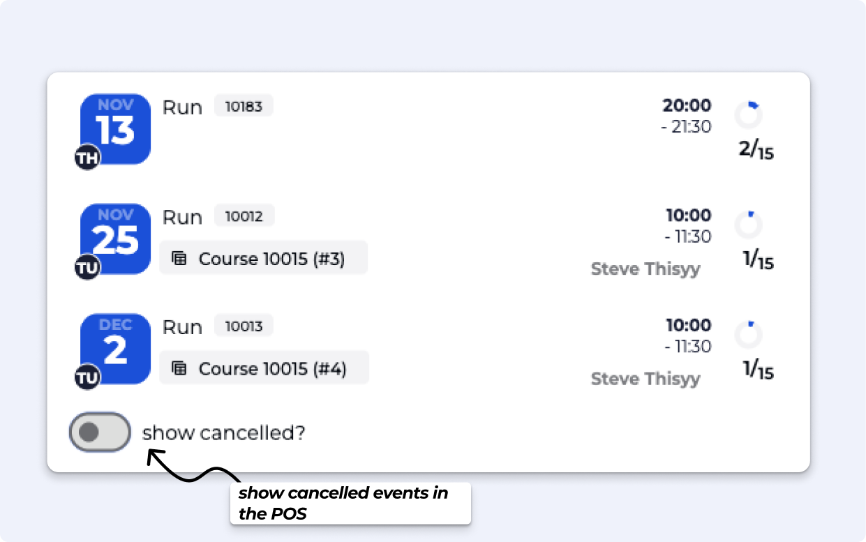 • Show Toggle for Cancelled Events in POS, for clarity on POS Checkout