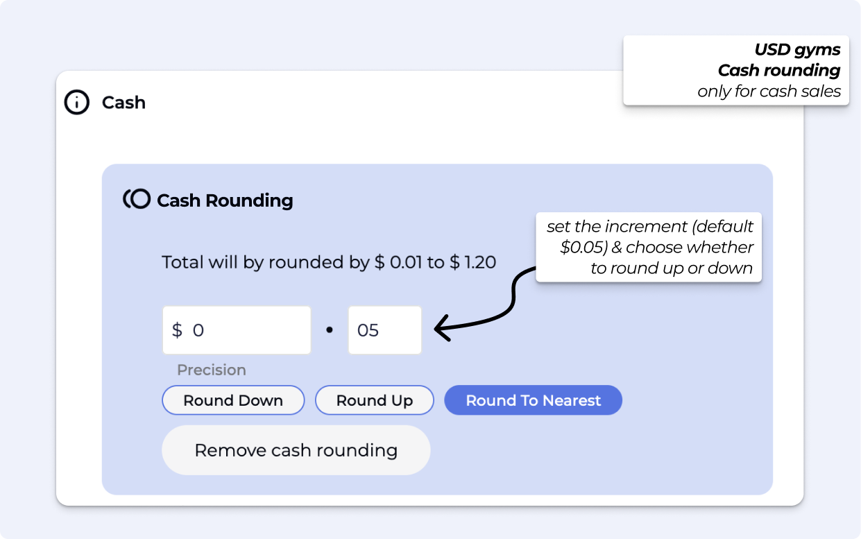 Cash Rounding (POS) for USD cash sales, you can now control rounding values directly in the POS. Set the increment (default $0.05) and choose whether to round up or down.