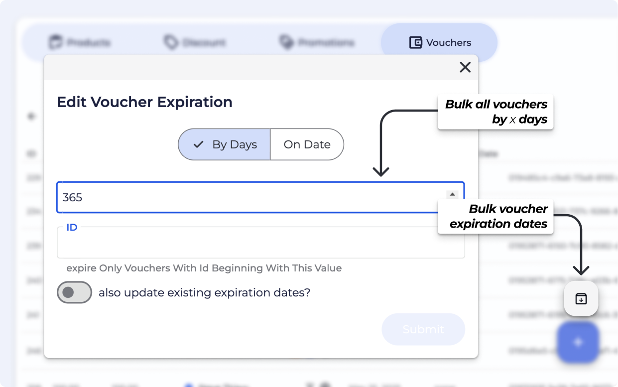 Bulk expire vouchers: Expire vouchers in bulk, by a certain number of days from Purchase date or set all to a fixed date.