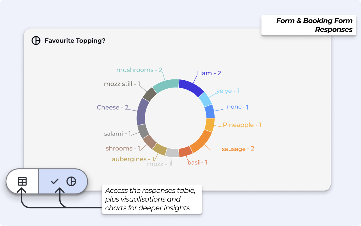 Form Responses: View charts and responses on documents, Booking Forms and Acknowledgment of Risk Forms (AOR). All tiers have access to the responses table, with visualisations and charts available on Business & above.