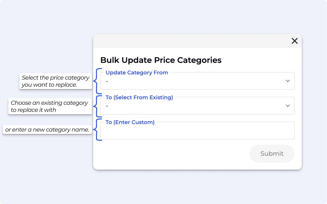 Bulk update price categories with the new Experiments tool, accessible from this link.