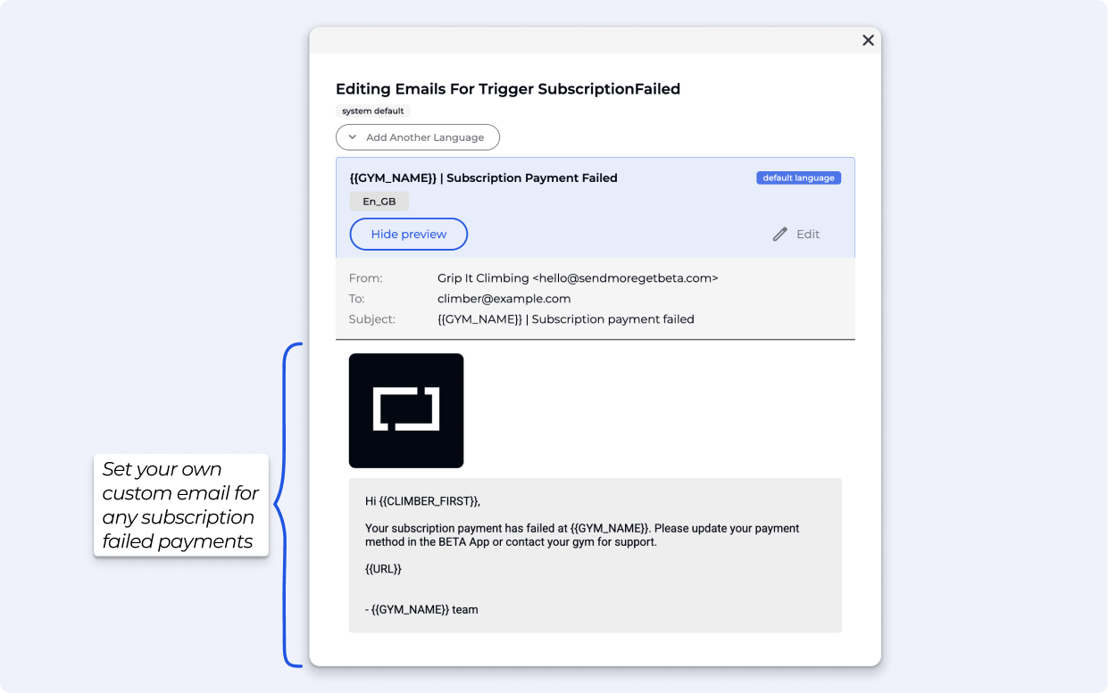 Payment Failed Email: Full customisation of the email sent when a subscription payment fails in Settings » Emails » subscriptionFailed. Available on Club & above.