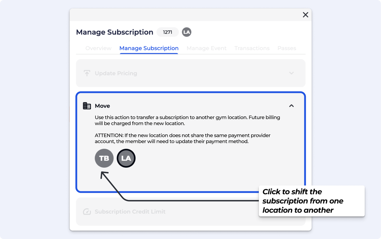 Move Subscriptions Between Locations: Transfer a subscription to another gym location. Future billing will be charged from the new location. Available on Business & above.