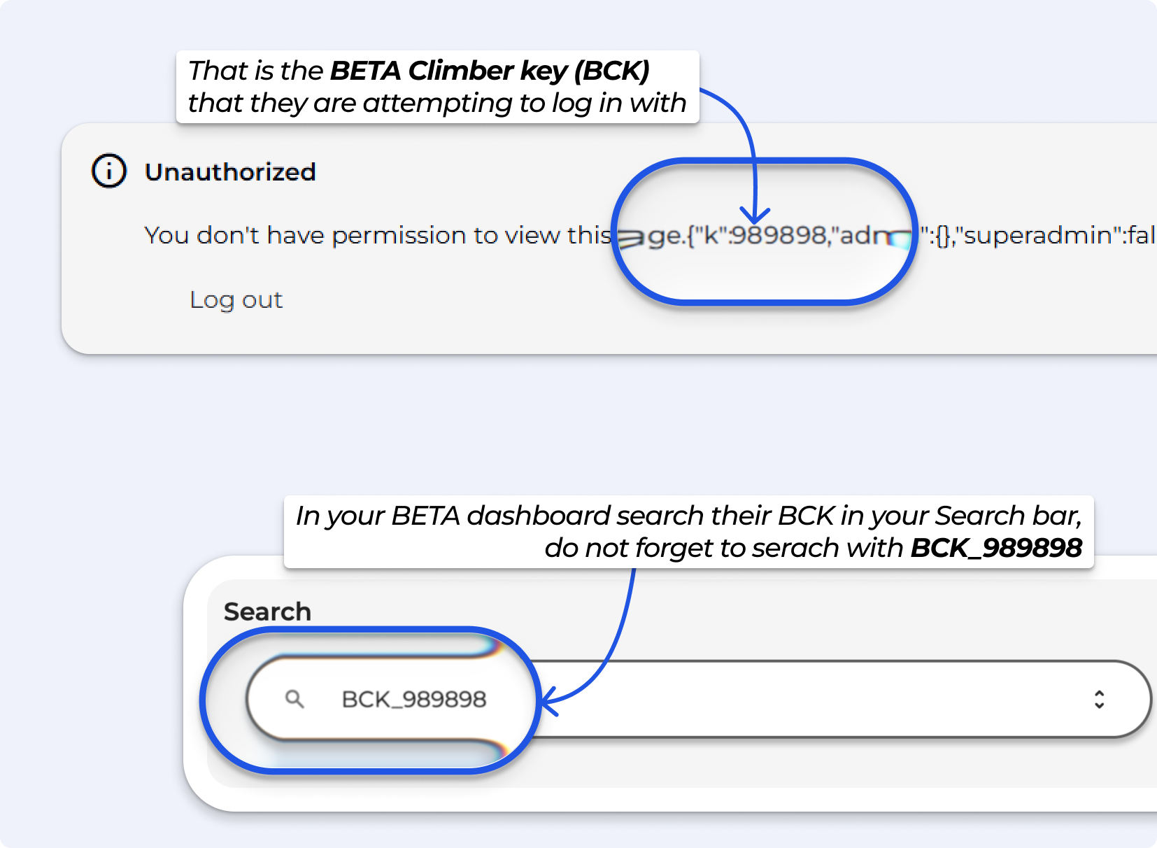 » The error screen will display the BETA Climber Key (BCK) for the account they are actually logging in with.In your dashboard, search for that BETA ****Climber Key.