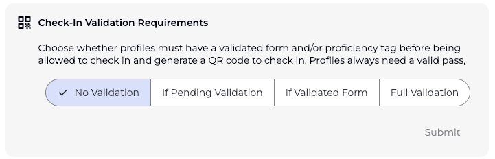 By default, each profile must have a valid pass to check in. Beyond that, you can choose what level of validation is required before QR code check-in is allowed.