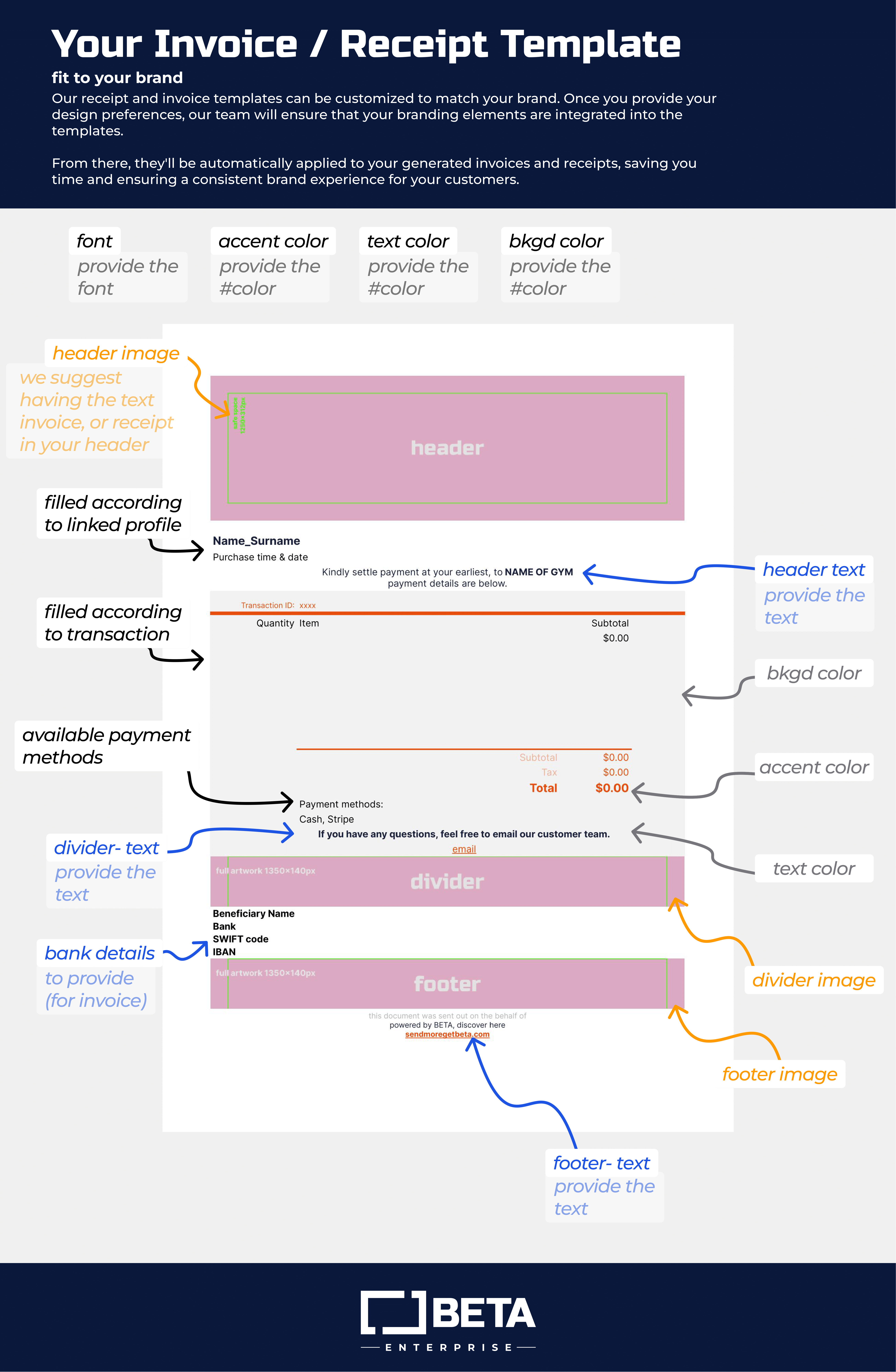 To set up or update your receipt/invoice template, please contact the BETA team with the following: