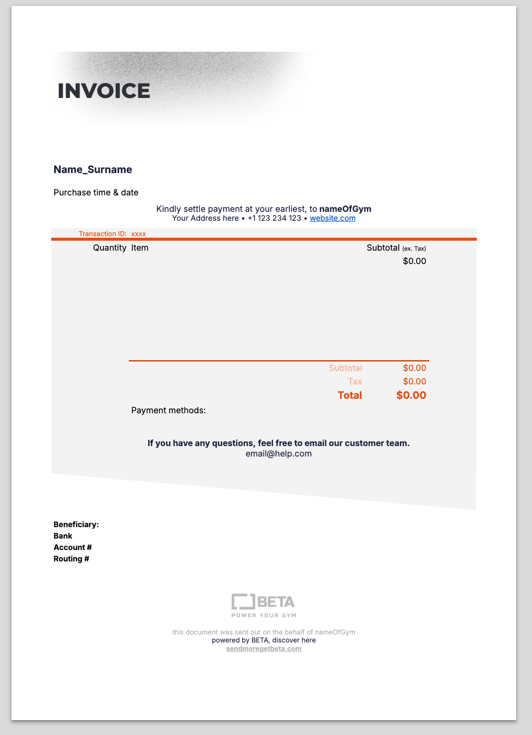 The BETA Onboarding Team will set your gym up with a default invoice template including your logo and gym information. The generic template email is displayed below.