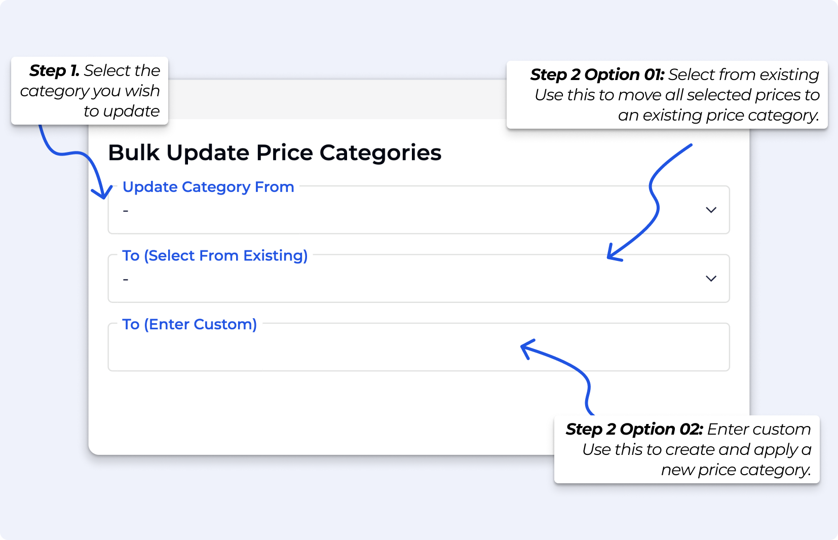 Bulk Update Price Categories allows you to update the price category for multiple prices at once, making it easy to reorganise or standardise your pricing.