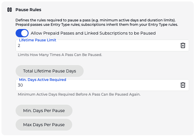 Pause rules will be configured per entry type. For subscriptions, these rules apply to hibernation. Rules apply retroactively to existing passes and subscriptions.