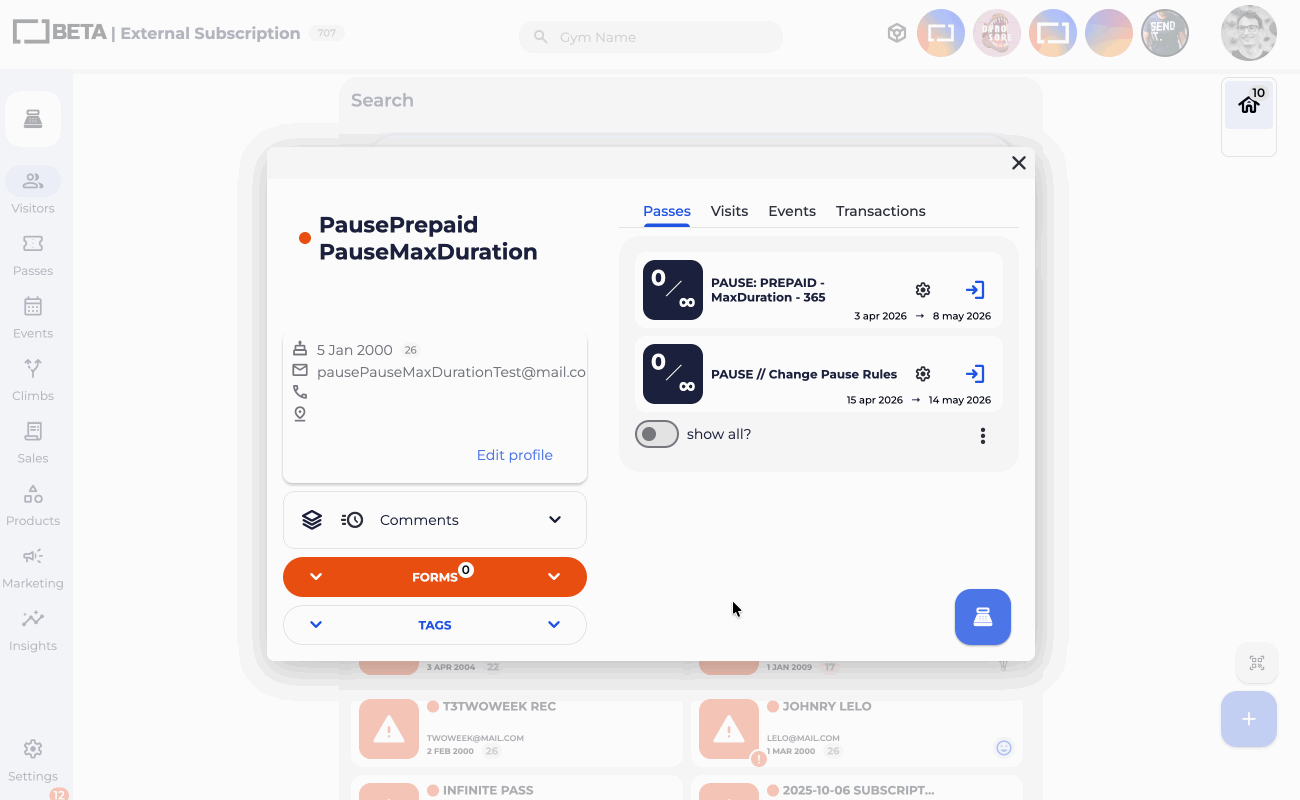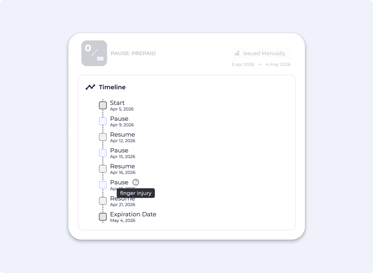 Example: A member has a 10-visit pass that expires on 30 April. They go on holiday from 15 April. Staff pause the pass on 15 April. The expiry date is frozen and no visits can be used while the pause is active. When the pass is unpaused on 29 April, the remaining visits and original expiry date are fully restored.