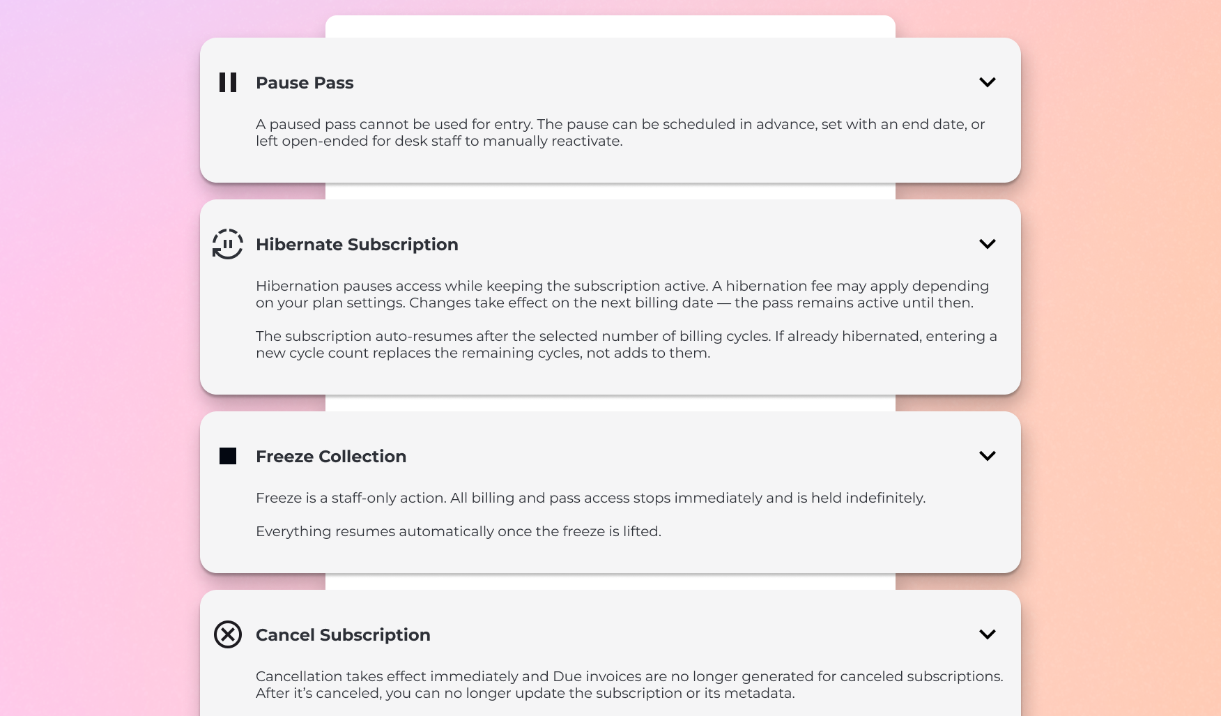 Cancel | Subscription | Existing pass valid for check-in until expiry | Stops completely | Members + Staff |