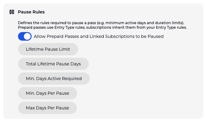 It depends on your Entry Type settings. In your entry type settings (Passes » Entry Type » Configurations » Pause Rules), there is a toggle: "Allow Prepaid Passes and Linked Subscriptions to be Paused."