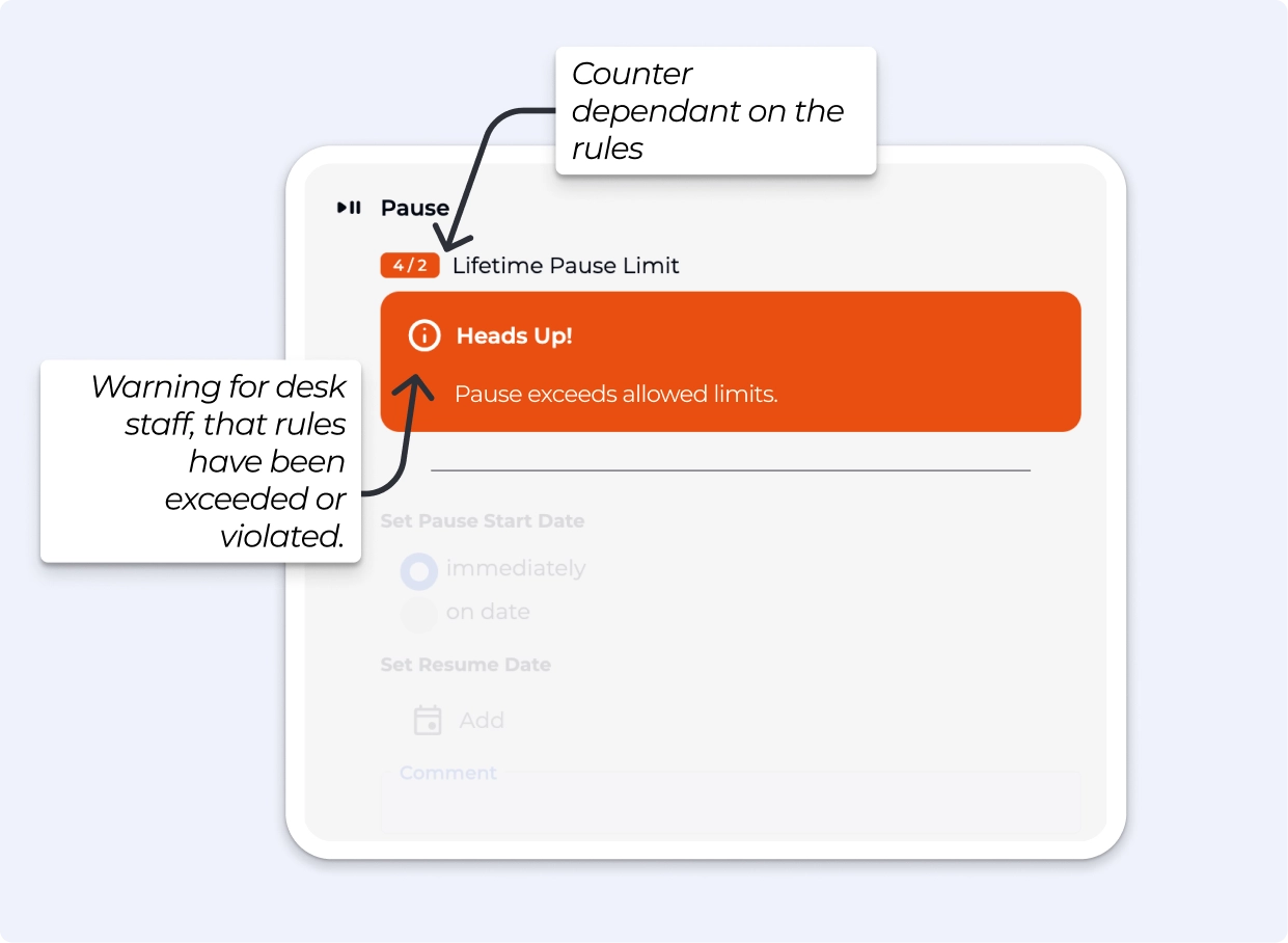 The ability for a member to bypass a pause rule via the Visitors' Home is tied directly to the override fee being set. Without it, if a rule blocks a pause request, the member simply cannot proceed.